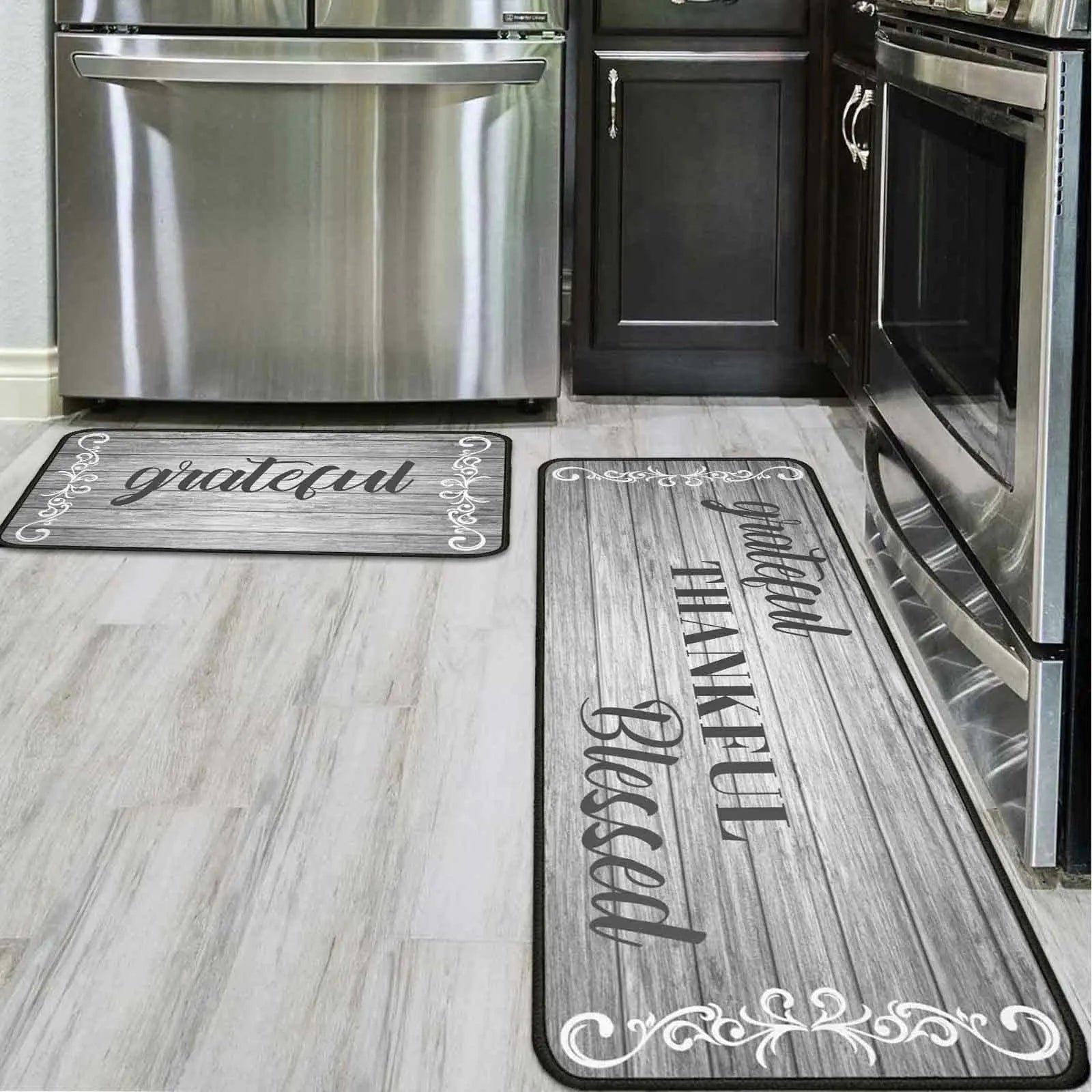 2Pcs Thankful Kitchen Rugs Set of 2 Grey Floor Mats for Cooking Non Slip Waterproof Standing Kitchen Runner Mats 17”x30”+17”x47”