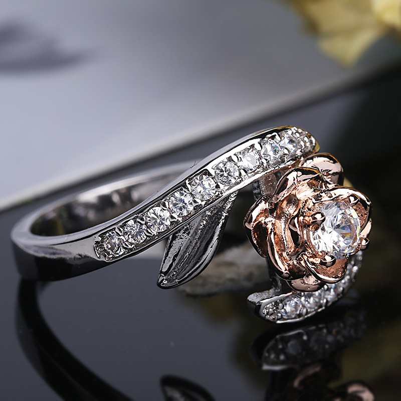 With its striking silver color, this ring is versatile enough to complement any outfit, whether you're dressing up for a special occasion or adding a touch of glamour to your everyday look. The intricate design features a beautiful rose flower motif, adorned with sparkling zircon stones, that captures the light and turns heads.